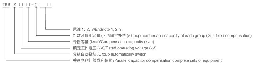 例如:TBZ10-1500(600+900)-AK 表示電壓為10kV, 裝置容量為1500kvar,分兩組自動投切,一組 600kvar,一組 900kvar, 單星型接線,開口三角電壓保護。
